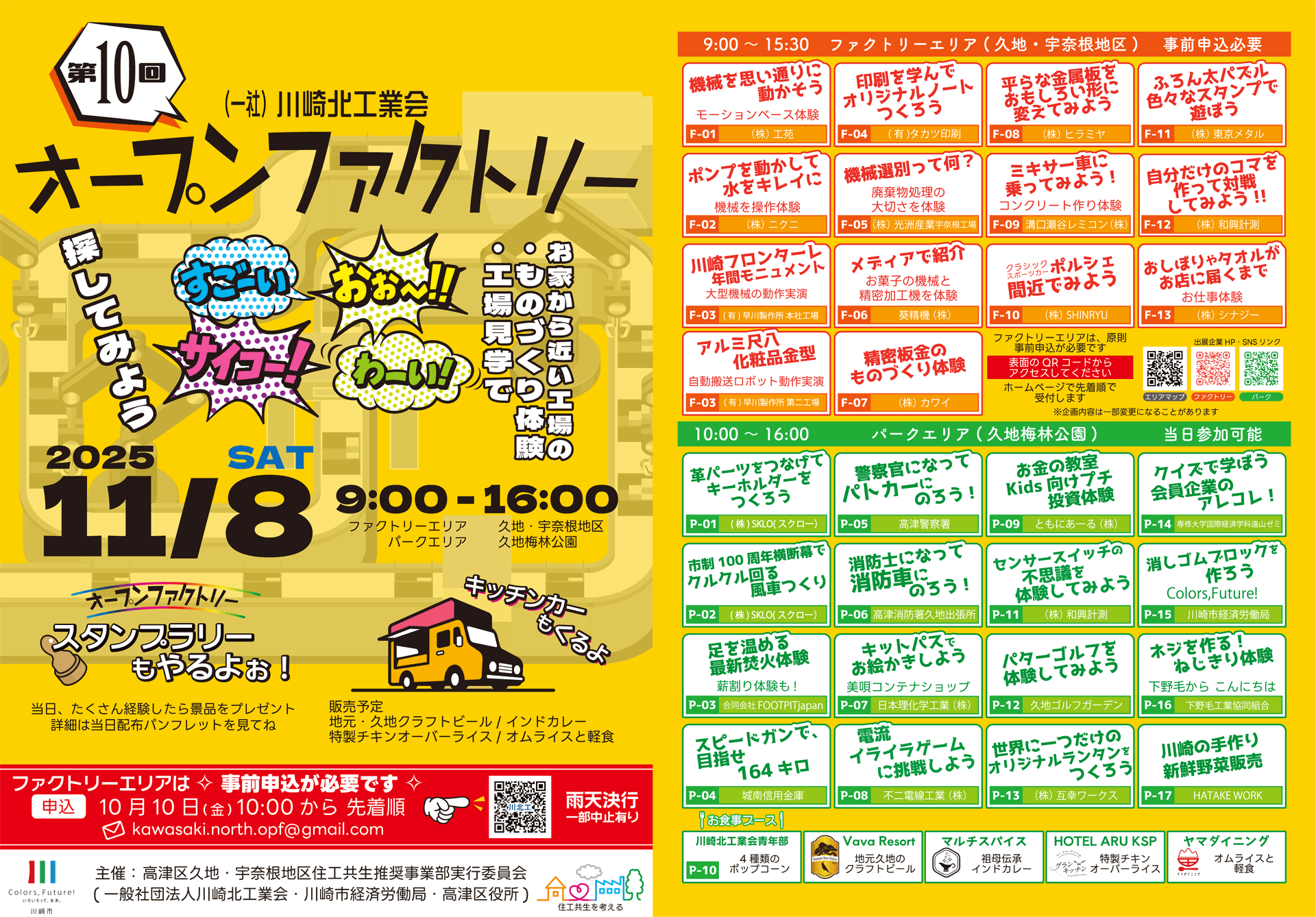 F-03(有)早川製作所(本社工場)金属を削り、ものづくりをしている会社です。豊富なマシンを見ることはもちろん、【川崎フロンターレ年鑑モニュメント】の加工から子どもも楽しめる様々なゲームや体験を用意しています!住所 川崎市高津区久地3-8-31TEL 044-811-2277URL https://hayakawass.jp/ (有)早川製作所(本社工場) 09:007 11:00× 13:005 ※数字は予約可能人数です。↑